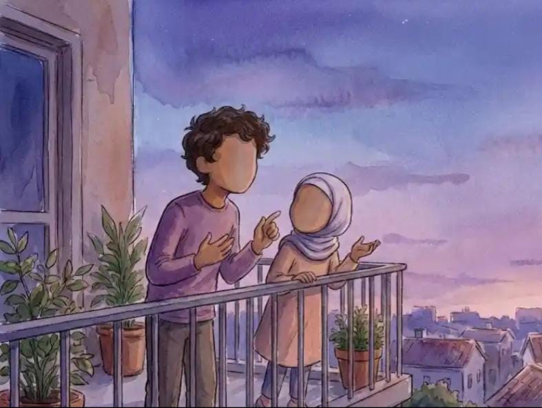 The sun slipped away, and the sky softened from orange to gentle purple. Amir and his little sister, Safiyyah, stood on the balcony. “Is it time to look for the new moon? ” Safiyyah whispered. “Almost,” Amir said. “We have to watch carefully. It might appear any moment.